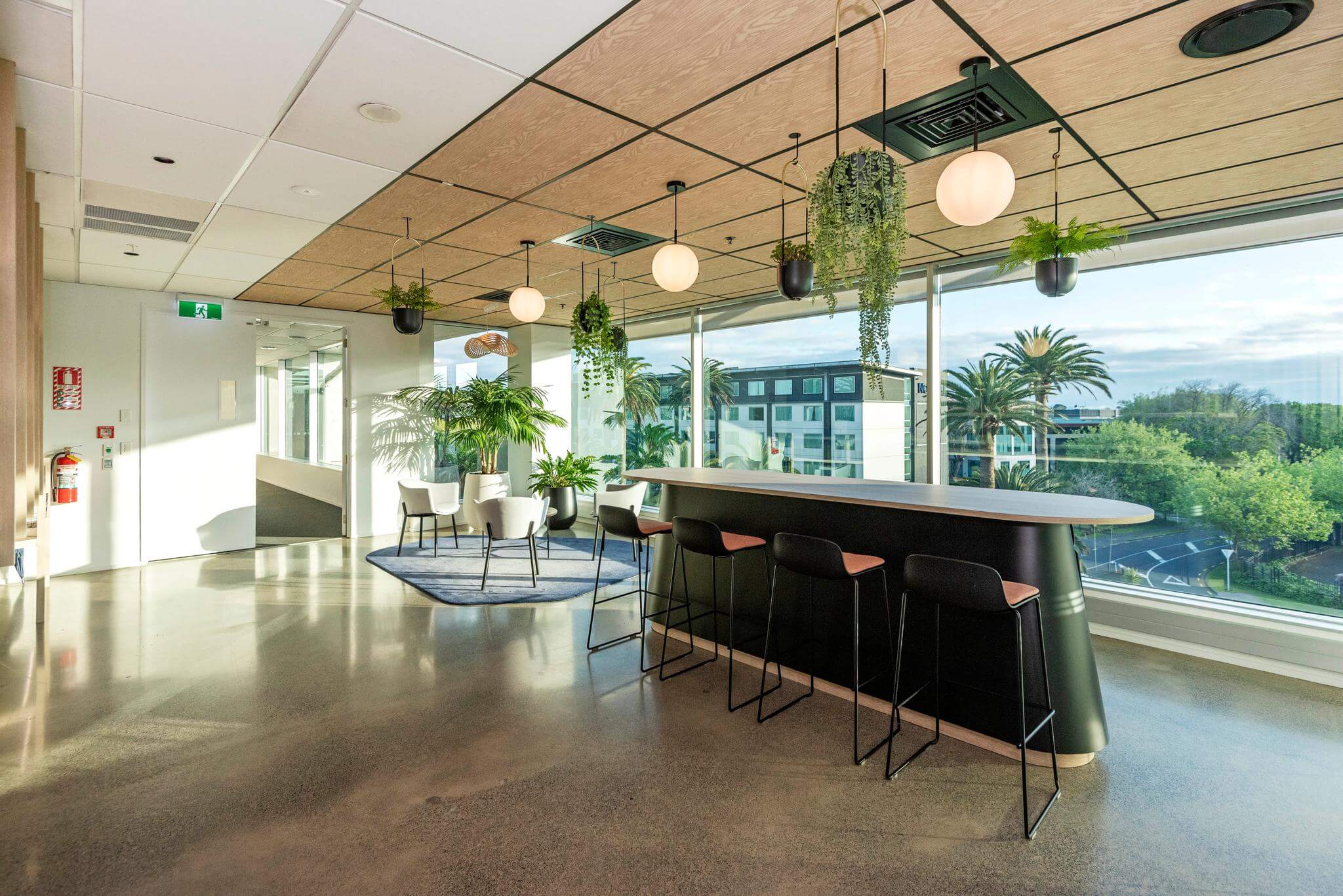 The brief was to make a little money go along way without looking cheap, the space chosen was being vacated by Philip Morris so there was an opportunity to maximise the possible reuse of the existing fitout whilst still transforming the space to be Markwell’s new home. The office comprises a collaborative front of house rather than a traditional reception – where they can meet visitors without having to go into the office space. This space has a great view and light floods in creating a surprise as you enter the space. There is a test kitchen with cladding that evokes the idea of a shipping container as a subtle nod to what they do. The hub of the space is a large staff collaboration and lunch area – opening up to the boardroom for maximum flexibility. The overall effect of the space is light and bright with lots of natural finishes and plants to create a relaxed and timeless office.