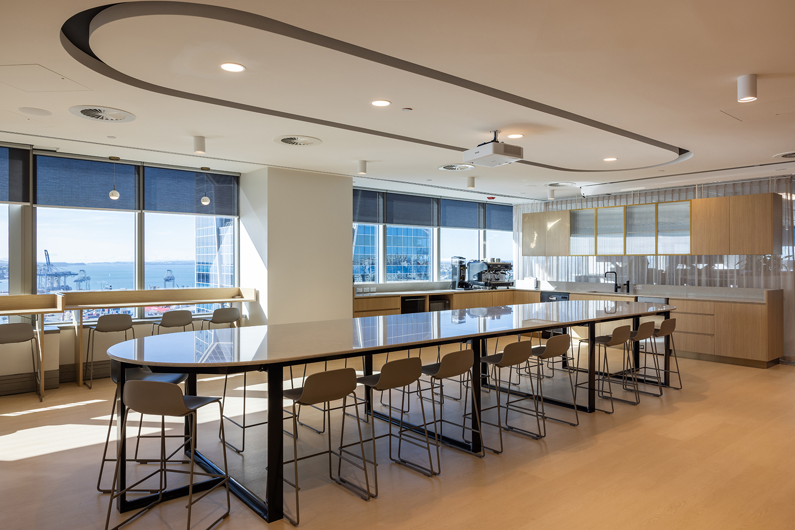 An operable wall offers flexibility in the front-of-house, allowing the space to adapt for meetings, presentations, or larger gatherings. A standout feature is the large banquette table — anchoring the kitchen and breakout zone as a place for team interaction, informal catch-ups, and wine tastings.