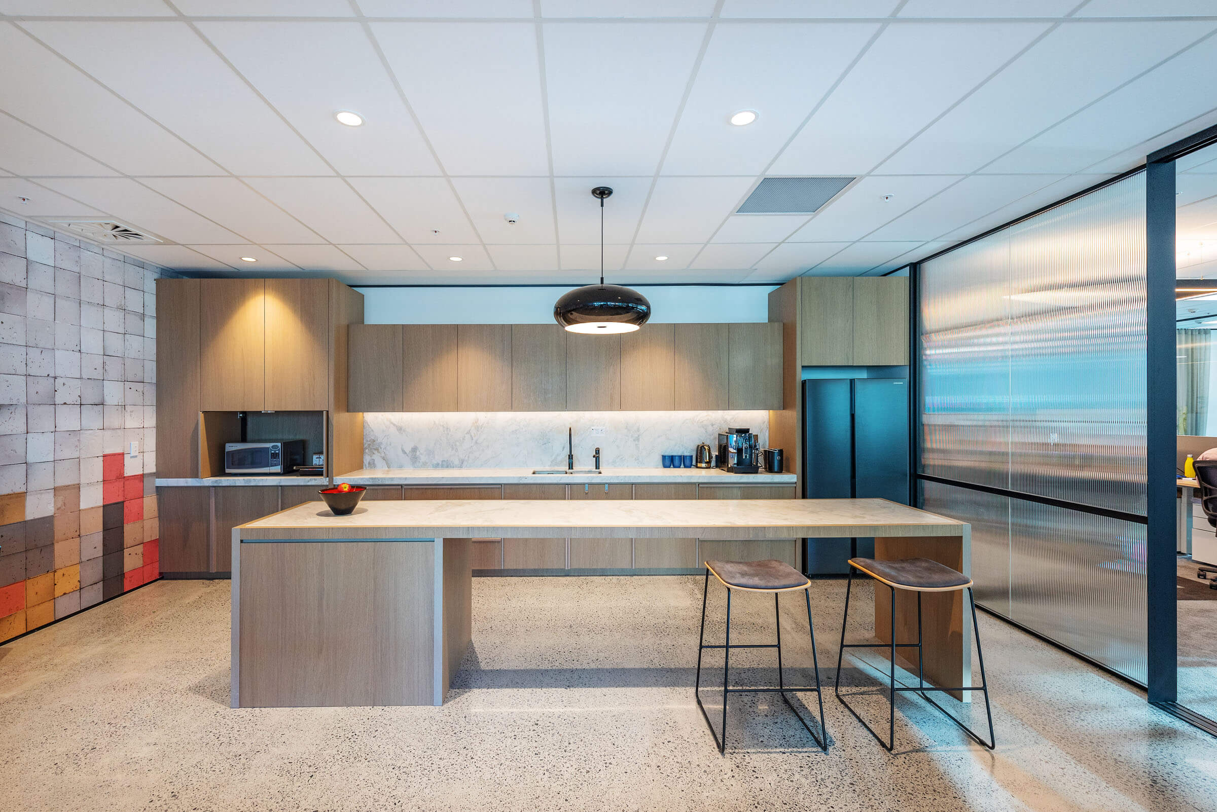 Another key feature to their new workplace was the café hub – the brief was to create a space for hosting social gatherings, breakouts, and office-wide events.